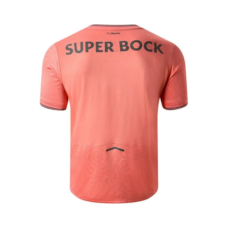 La camiseta visitante del FC Porto 2025-26 presenta un diseño audaz inspirado en la pasión de la afición del club. Un llamativo tono rosa degradado presenta un estampado geométrico integral, con el escudo del club, los números, la marca y los logotipos de los patrocinadores en gris pizarra. Esta combinación de colores y gráficos es una interpretación abstracta de la atmósfera inolvidable que rodea los momentos más importantes del fútbol.